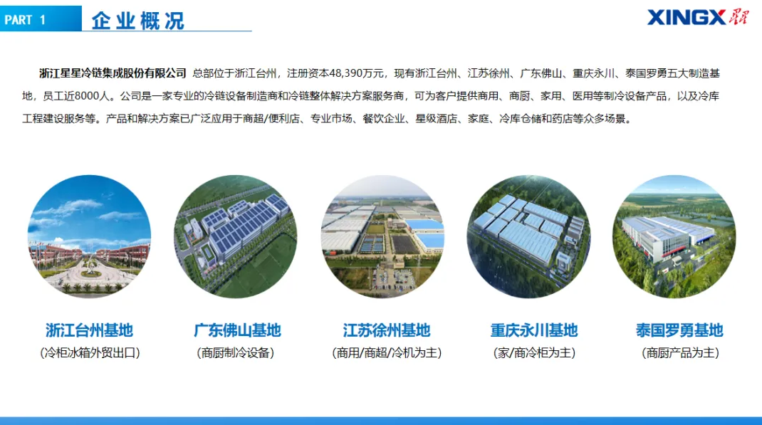 浙江星星冷链集成股份有限公司总部位于浙江台州,注册资本48,390万元,现有浙江台州、江苏徐州、广东佛山、重庆永川、泰国罗勇五大制造基地,员工近8000人。公司是一家专业的冷链设备制造商和冷链整体解决方案服务商,可为客户提供商用、商厨、家用、医用等制冷设备产品,以及冷库工程建设服务等。产品和解决方案已广泛应用于商超/便利店、专业市场、餐饮企业、星级酒店、家庭、冷库仓储和药店等众多场景。