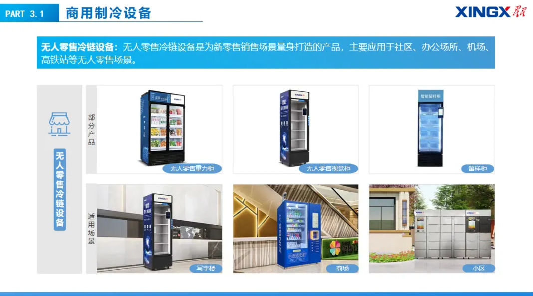 无人零售冷链设备:无人零售冷链设备是为新零售销售场景量身打造的产品,主要应用于社区、办公场所、机场高铁站等无人零售场景。